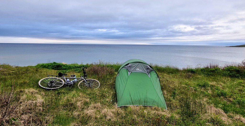 My first day north along the eastern shore dragged somewhat; it was a bit like cycling just for the sake of cycling. The mist was thick, the drizzle persistent. Not even the word dreich covered it. This was wet drizzle, and my carefully planned campspot down a track beside a remote beach felt way too bleak in this weather, so I retraced my steps to a small opening in the trees not far off the road. The advantage of the lack of scenery was that my mind turned to poetry – a first draft response to Elizabeth Bishop’s poem ‘The Fish Houses’, of which I’ve passed many.