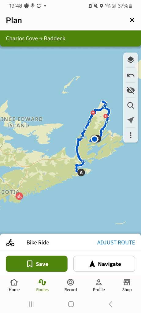 Ok, not my best joke. Even my Dad said it wasn’t very funny, and he’s the master of unfunny jokes – he’s spent too much time in New Zealand to still find the naming of places after Scottish places, and the strange geographical juxtaposition of them, entertaining. But it kept me going for that hour at a point in time when my legs were struggling (the Scottish distance would be 128 miles, which would take me – what, say, two hours?!) Over the course of the last six days I have continued up the Eastern shore from Charlos Cove to the Canso Canal which separates Cape Breton from mainland Nova Scotia, up the Ceilidh Trail along the SW coast of Cape Breton, around the Cabot Trail which loops through the Highlands National park, up to Meat Cove at the far north of Cape Breton, and back down to Baddeck, 40 miles north of the Canso Canal. I’ve got limited time before I catch the Amtrak train in upstate New York, and I’m keen to leave enough time to cycle the scenic Route 100 in Vermont, so I’m now enjoying a rest day in a campsite here before catching the bus back to Halifax tomorrow. My first ‘cheat’ of the tour; I’m owning it!