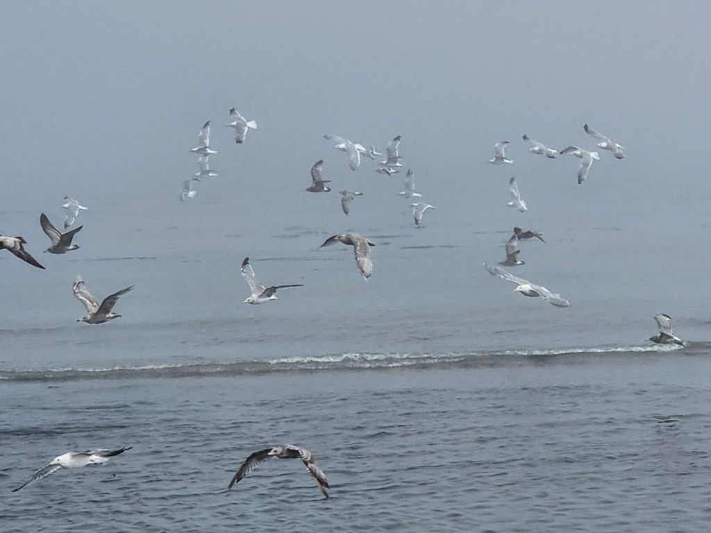 After a late night (well, for me anyway – probably only 10pm) I was in no rush the next morning to set out on a 12 mile run along the sandy spit; I’d not quite forgotten how much the Savary Island run had taken from my legs. The mist was down, and I could see no point in hurrying out running before one large coffee. Two. Still the mist lay low. I had better get going… A Towhee bird scampered through the undergrowth on my way to the spit. My poet friend Jonathan Skinner had recommended this walk out into the sea because you could feel like you could touch the liners. Today though, all that I could touch was thick wet air. A foghorn from the lighthouse boomed periodically, making it feel even spookier, not safer. The spit was more of a bird habitat than a human one, and I took to walking through immense groups of several hundred seagulls of various kinds so as not to set off flusters of wings and beaks and cries. I overtook a good number of people as I ran, but none coming the other way. And I’d already run about 4 miles when the ranger’s ATV passed, everyone on board waving and smiling to me as they went, unaware that they were about to come across the body of a 32 year old man from Portland  on the beach ahead…