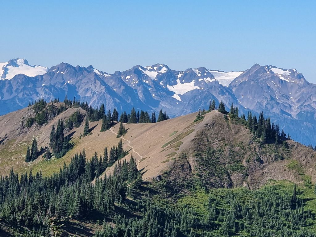 I felt shaken that afternoon, and was glad I’d planned a fairly easy ride after my run – right enough mainly uphill but only 17 miles to the Heart O’ the Hills campground in Olympic National Park. Having had to leave the Rockies sooner than I’d hoped, I most definitely needed one last dose of mountains between here and the Andes. And Mount Angeles and the Klahane Ridge, up above the mist and fog that persisted down near Port Angeles and Dungeness, didn’t fail to deliver. The scrambling towards the summit of Mount Angeles was more involved than I was up for (alone, overseas), but the views across to the glaciers on Mount Olympus and down over the inversion above the sea were spectacular. And the Klahane Ridge extended north towards the sea on narrow paths which offered the best running I’d experienced all trip (if only my legs hadn’t felt quite so fatigued from running in sand the day before); along along and along and down to Lake Angeles whose turquoise waters did their best to ease the pain in my legs when I went for a swim. But failed. The resultant DOMs (delayed onset muscle soreness) lasted the whole next week – I could barely even crouch down enough to get into my tent. I’d taken the shuttle bus at the start of the day up to 5,500 feet, which in addition to the significant climbing I did myself, meant there was a long way to run down. My quadriceps came to know it.