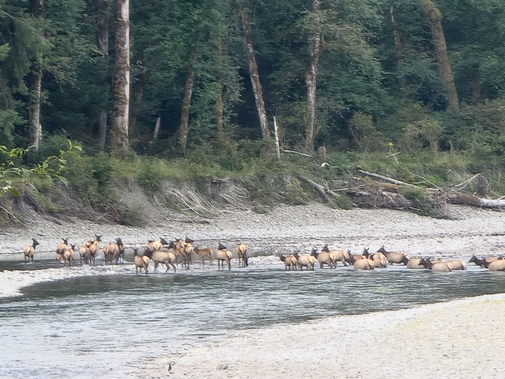 Google satellite maps is a great tool for finding stealth camp spots; on this occasion, it was especially useful since I was mainly going to be travelling through (a) deep forests and (b) native reserves. Yet just beyond the Queets river, just beyond the reserve boundary, I spotted an area of river-beach (which in fact turned out to be a state recreation site) which was perfect. I gave the portaloos a wide swerve, and wandered a good quarter mile down the river shore to a spot where no trucks would come off-road marauding…the patterns in the pebbles told a tale in that regard. And yet not a vehicle nor a person disturbed me. The following morning, the only things marauding were two otters splish splash playfighting in the river, only several metres away. And when I got on the road – promptly for once, despite two coffees – I witnessed an entire herd (50 or so?) of elk crossing the river, just like in a wildlife documentary.
