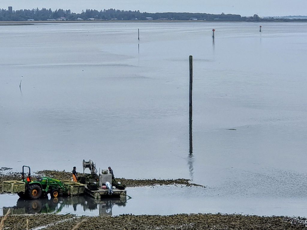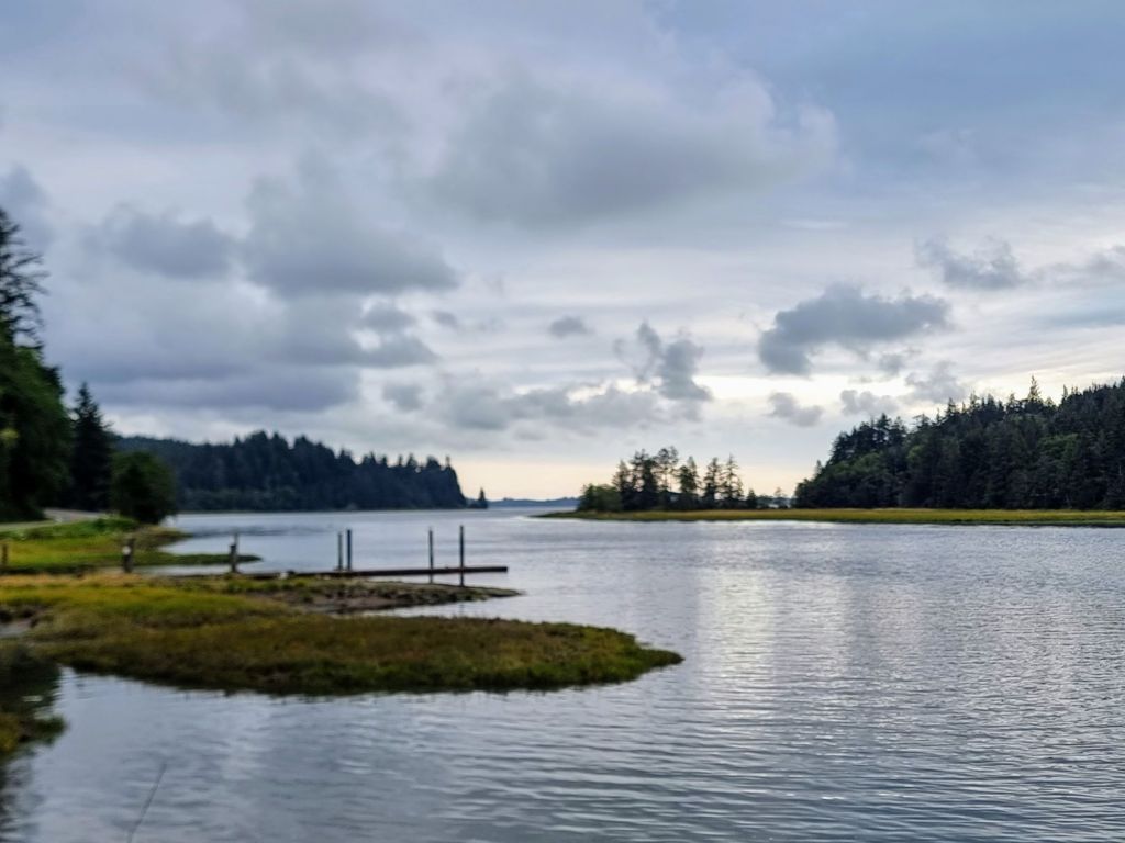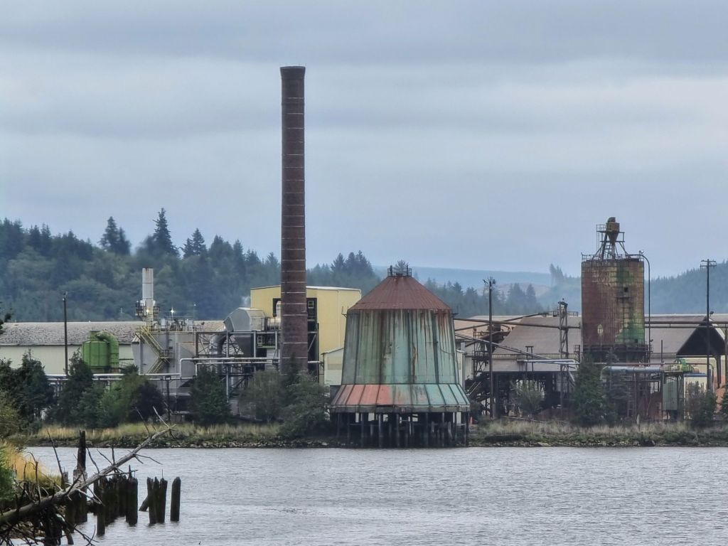 It was another grey Washington state day, and the estuary south of Aberdeen muddy. Westport is mainly known for oysters and fishing and great surfing. But while the coast south of there is lined by sandy beaches, again it felt like the holiday area which had been forgotten. This was high season. School holidays. Where were all the people? Certainly not mist bathing on the beaches. I preferred the landscape as it turned back inland again and became more estuarial and marshy. It was a different kind of a landscape than I’d experienced so far, and the views clear of trees. Oysters continued to be a major local business, and that and logging provide the basis for Raymond, the next town down the road.